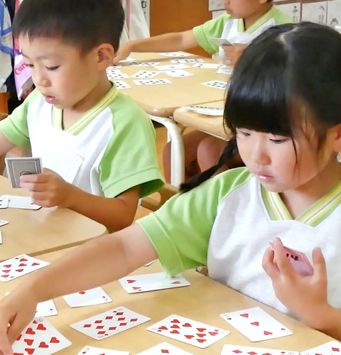 学習を進めるにあたって、いろいろな遊びから『文字の読み』『かず』『書き順』など基本を学びます。幼児期の子どもは生活のほとんどが遊びです。教え込んだり無理に覚えさせようとすると、かえって興味や関心の芽をつんでしまいます。遊びがおもしろければ、子どもたちは「もっと知りたい」「もっとわかりたい」と自発的に文字や数、知識への興味を深めます。幼児期の子どもの可能性は無限大。その可能性の枝を増やし伸ばすことが本園の知育の目的です。小学生になった時に勉強が嫌いにならず自信が持てるように、楽しく知育プログラムを進めています。